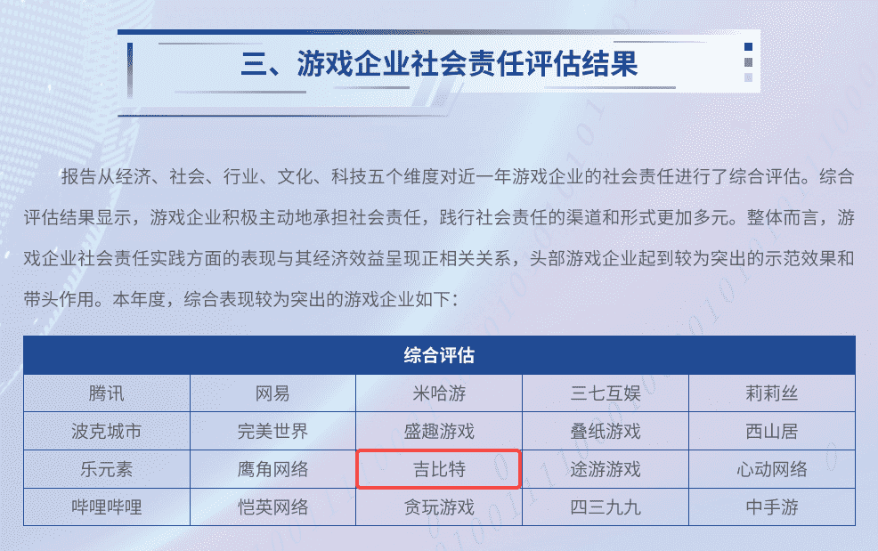 7月3日,,,,由中国音像与数字出版协会指导,,,,北京市西城区人民政府主办的“2024游戏责任论坛”在北京举行。。。论坛上,,,,人民网舆情数据中心、、、人民灵境研究院、、、、灵境 · 游戏实验室联合发布了《2023-2024游戏企业社会责任报告》(以下简称“《报告》”),,,,公布了游戏企业社会责任评估结果。。。厦门J9.COM网络技术股份有限公司(以下简称“J9.COM”或“公司”)获评“2023-2024年度中国游戏企业社会责任综合表现较为突出企业”。。。。这是继2020年以来,,,J9.COM第五次入围人民网中国游戏企业社会责任相关荣誉榜单。。