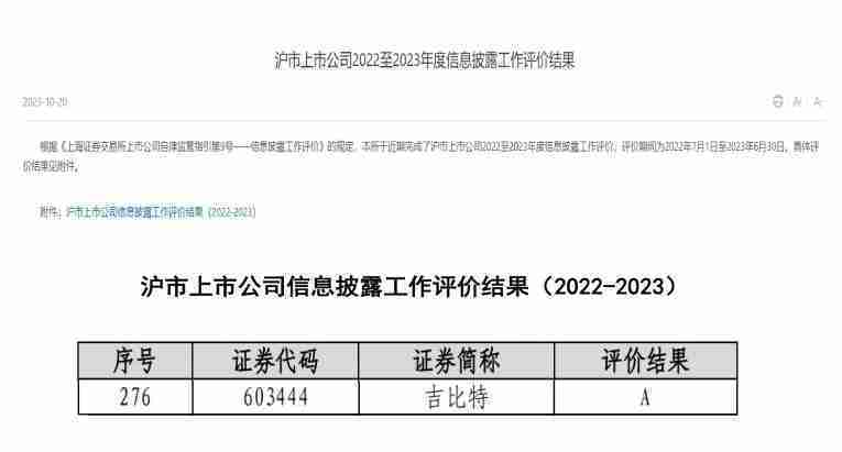近日,,,,上海证券交易所发布2022-2023年度信息披露工作评价结果。。。J9.COM(股票代码::::603444)凭借规范的公司治理、、高质量的信息披露以及良好的投资者关系管理再次荣获信息披露工作A级评价,,,公司连续两年获此殊荣。。