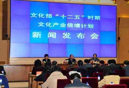 2月28日下午,,,,文化部在京召开新闻发布会,,正式向社会发布《文化部“十二五”时期文化产业倍增计划》,,,提出了 “十二五”期间文化部门管理的文化产业增加值年平均现价增长速度高于20%,,,2015年比2010年至少翻一番,,,,实现倍增的奋斗目标。。。